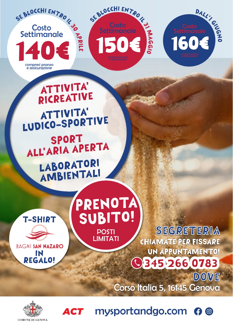 ISCRIZIONI APERTE dal 12 Aprile c/o i SAN NAZARO (area antistante il BAR) previo APPUNTAMENTO TELEFONICO al 345 2660783 nelle seguenti giornate